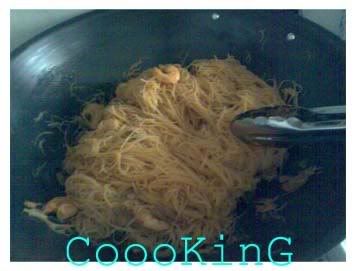 heat your wok and oil. once hot, fry the onions and chili paste till the aroma rise. den add the seafoods. fry till its cooked and add the mixed SriAji water. once the aroma of the SriAji rise, add the bee hoon. toss it a few times and cover the wok to let the bee hoon get cooked. if its too dry, add more water before u cover.