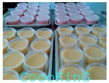 in this size plastic mangkuk (can be found at any SKP store), u can make 24 sets.once the milk has boiled, turn off the heatand stir in he dadih powder. be warned! there is another small packet label 'fruit sugar'. do not add dat first. mix the powder well for 5 minutes. add any food colouring if u want. aft 5 minutes, add the fruit powder. mix well and pour into the mangkuks. do it fast or it'll harden.